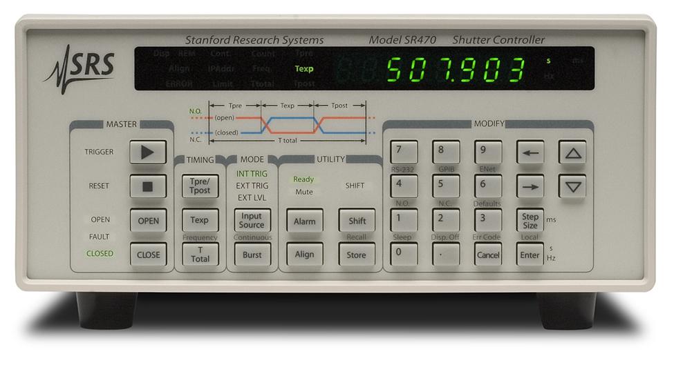 SR470激光快門控制器可以給快門頭發出信號,達到控制快門開合的目的。曝光時間可以靈活設置,在0.1ms 的分辨率下,時間設置范圍為:4ms 到10000s ;可以設置先曝光和后曝光的時間;8 位數LED 顯示器顯示目前的參數為秒或是赫茲,時間可以精確到100ppm。SR470激光快門控制器具有多種觸發方式:內觸發、外觸發及面板操作。SR470具有GPIB、RS232及以太網等接口,支持遠程控制。所有的設備功能都可以通過任何一個接口進行控制和讀取。SR470 快門控制系統具有自動檢測功能,若快門發生故障,可以通過顯示屏看到故障提示或聽到故障報警,能幫助您及時發現并排除故障,提高了實驗的可靠性。