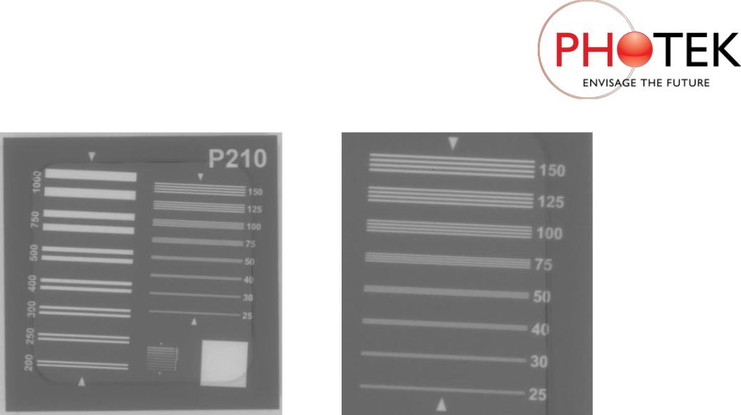 (a) 中心分辨率圖像 (75mm FOV)       (b) 中心分辨率 (75mm 視場)線寬25-150µm