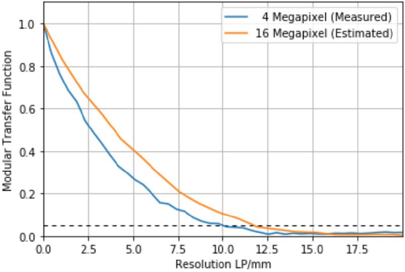 如圖5所示,將曝光時間從300秒減少到30秒不會影響測量的對比度或計算的MTF曲線。將曝光時間減少到30秒以下,測量對比度和計算的MTF曲線的趨勢相同,但引入了更多的噪聲,如圖6所示。然而,MTF曲線小于5%的點保持在9.5–10.5 lp/mm之間 。
