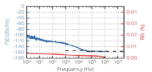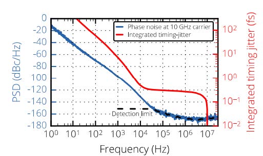 圖 1 是典型的光學 ADC 配置。 要進行數字化的源信號在光學域中進行采樣。這是通過電光調制器實現的,該調制器根據輸入信號相應地調節來自MENHIR-1550激光器的脈沖強度。脈沖串強度完美地反映了輸入信號, 其在精確和已知的時間被采樣。激光的超短脈沖寬度(<250 fs)確保了即使在快速變化的輸入信號下也能進行良好的采樣。提高ADC的性能的關鍵是減小光孔抖動,即在正確的時間采樣。圖2顯示了MENHIR-1550激光器的時鐘抖動性能。在1 GHz的重復頻率下,10 kHz至1 MHz的頻率范圍內可以實現小于1 fs的時鐘抖動(更高版本可定制)。