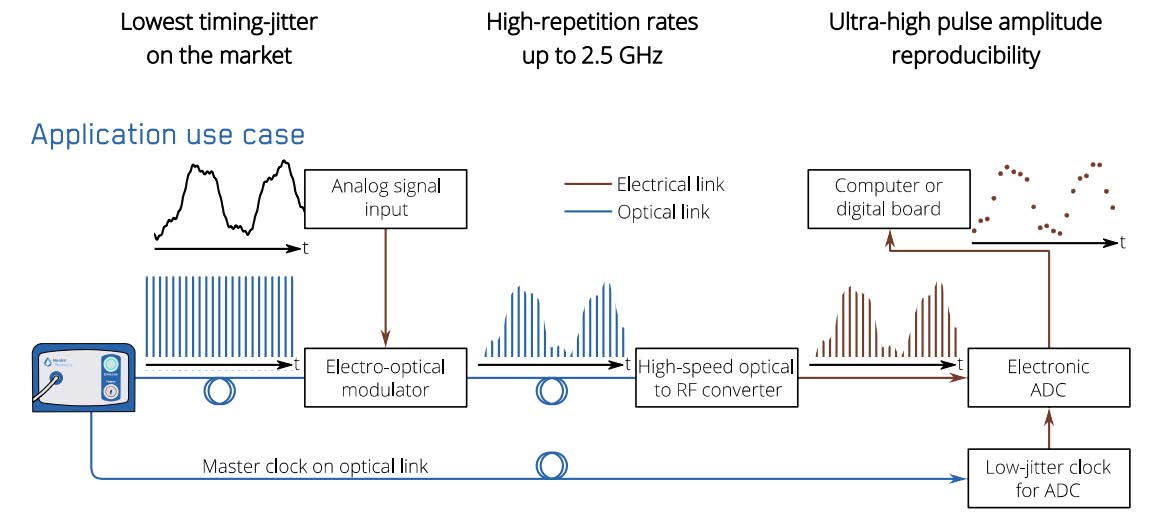數據數字化為電信、雷達和信號處理方面帶來了前所未有的機遇。幾乎所有現今使用的傳感系統都需要將模擬信號轉換為數字信號。信號速率增長的速度超過了電子模擬到數字轉換(ADC)的速度。更高帶寬、速度或數字化精度的需求對于ADC設置的孔徑抖動提出了嚴格的要求。改善ADC的一種方法是使用由光子解決方案提供的較低定時抖動時鐘源。光子ADC不僅僅改善了時鐘抖動,使用像MENHIR-1550激光這樣的鎖模激光源可以實現各種新的超快光子數字化技術。