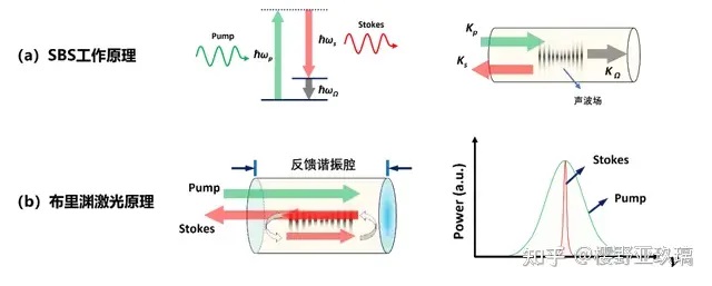 前向行進的泵浦光強度達到一定閾值后,在光纖中會激發電致伸縮效應,而產生聲波,這個聲波的能量來源可以認為是一部分泵浦光的光子非彈性碰撞轉化來的,此聲波會致使纖芯的折射率被周期性地調制,相當于產生了一個聲波誘導的與泵浦光行進方向一致的移動布拉格光柵。我們知道光子非彈性碰撞也遵守能量守恒和動量守恒。于是上述若干泵浦光子Kp泯滅后既產生了和原泵浦光同向的聲子Ko,也由于動量守恒會同時產生一個反向運動的光子Ks。由于能量守恒,Ks光子能量會小于原Kp泵浦光子能量,Ks振動頻率就是原泵浦光子Kp激光頻率減去聲波頻率,Ks的這個向下頻移我們稱之為Stokes斯托克斯頻移。由于多普勒效應,相對于前述正向移動的聲波場,背向傳輸的Ks-Stokes散射光的振動頻率和彈性碰撞的瑞利散射頻率是一致的,兩者就會產生干涉效應,干涉相漲時就會產生更強的正向聲波場,同時會激勵更強的調制效應,產生更強的背向Ks-Stokes散射光,如此反復背向Ks-Stokes散射光強度會和激光諧振一樣,不斷放大成為一束頻率比泵浦光略低,傳播方向反向的Stokes激光,最終甚至可能吃掉泵浦激光大部分能量,轉化效率高到甚至有望生成輸出功率和泵浦激光功率相當的受激Stokes激光。這個過程就是SBS- Stimulated Brillouin Scattering受激布里淵散射激光的發生原理。