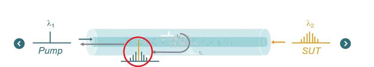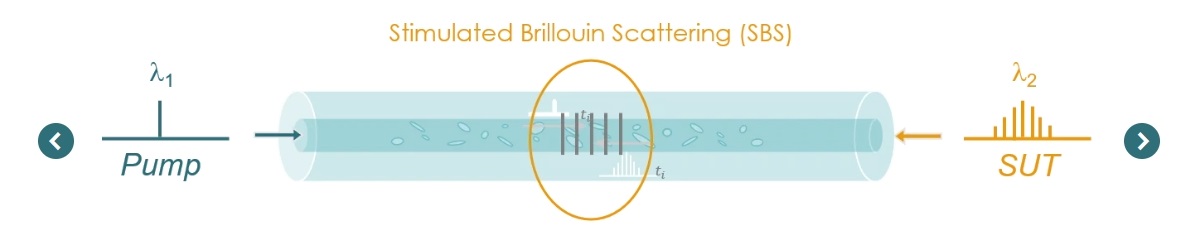 如圖四. 一束可調諧激光耦合進布里淵增益優化光纖,產生光纖內周期化調制結構,也就是形成一個移動的布拉格光柵,同時右側耦合進客戶待測信號SUT(Signal Under Test),待測信號里面包含不同的波長(頻率)成分是客戶所希望分析的。