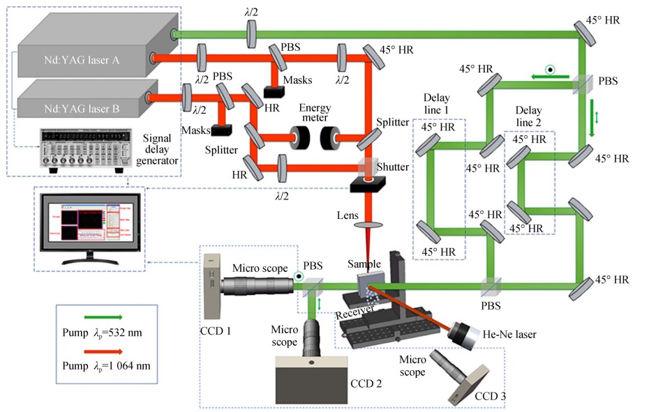 泵浦-探測技術:對于更高功率或能量的激光應用,激光可能對于樣片產生三維的損傷,也就是說損傷可能深入到樣片內部很多。此時泵浦探測法可以成為一個有效的檢測手段,簡單來說就是一束高能激光用于擊打樣片產生損傷,而我們可以同時較小比例的引出另外一路激光,將其倍頻到可見光(一般倍頻到綠光以匹配硅基成像相機高靈敏度的波段)做為探測光,此時這一束綠色的探測光就可以作為一個超高亮度照明光(比普通明場照明亮度高上萬乃至更多),照亮了縱向損傷區域,便于顯微鏡加相機拍攝整個的縱向損傷區域的圖樣。 進一步的,由于探測光也是脈沖光,且和泵浦光是同時產生的,當我們在探測光光路內插入光學延遲線后,可以非常精密的控制探測光相對于泵浦光的時間延遲,也就是說我們還可以利用泵浦探測術精密的拍攝高能激光輻射后某一個特定時刻的損傷形態,當我們多次重復以上不同延遲時間的泵浦探測實驗后,則可以統計描繪出樣片縱向區域各個時刻的損傷變化趨勢圖樣。