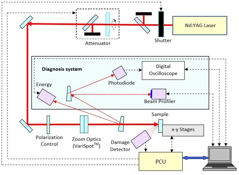 首先分析一個自組LIDT激光誘導損傷閾值檢測系統
