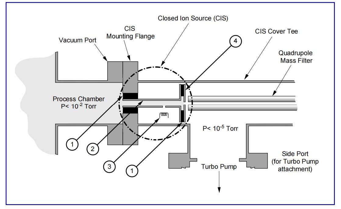 在需要測量10−4和10−2Torr之間的壓力的應(yīng)用中,通過用封閉離子源(CIS)采樣系統(tǒng)取代傳統(tǒng)的OIS PPR配置,可以顯著減少背景和工藝氣體干擾的問題。一個通用的CIS設(shè)置的橫截面如圖3所示。