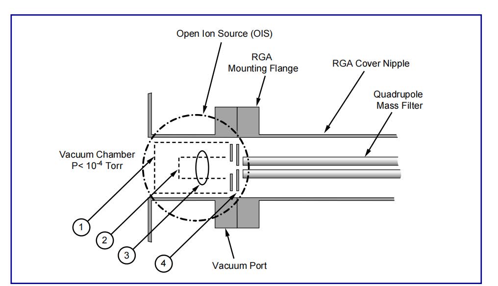 在大多數(shù)商用RGAs中使用的標(biāo)準(zhǔn)離子源是開放離子源(OIS)。這種電離器被認(rèn)為是RGA的“全做”源。自20世紀(jì)50年代初以來,它就一直呈圓柱形,軸向?qū)ΨQ的形式存在。通用的OIS設(shè)計原理圖如圖1所示。