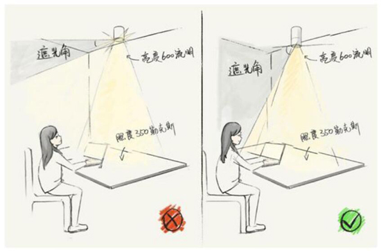 圖中左邊燈光直接照射人眼,會(huì)使人眼感覺不適;右側(cè)燈光照射到工作區(qū),光線反射到人眼,工作區(qū)可見度高,人眼也舒適。