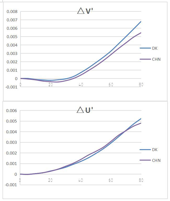 案例二 Viso對(duì)比國(guó)內(nèi)大型COB芯片廠商,不同角度光度數(shù)據(jù)由于不同角度的光度數(shù)據(jù)量較大,直接看數(shù)據(jù)也不夠直觀,因此作如下圖,取0-80°的CIE1976色坐標(biāo)(u’和v’)的變化作圖(與0°的對(duì)比),其中藍(lán)色曲線DK為丹麥Viso數(shù)據(jù),紫色CHN為國(guó)內(nèi)客戶在華南某計(jì)量院測(cè)試數(shù)據(jù)。由下圖可以看出,Viso與傳統(tǒng)分布光度計(jì)測(cè)試的趨勢(shì)完全吻合。另外,COB從中心位置到邊緣的,越到邊緣的變化應(yīng)該是越大的,因此色坐標(biāo)的變化曲線也是應(yīng)該是越陡(斜率越大),從圖中可以看出Viso的數(shù)據(jù)更加的符合這種客觀變化。