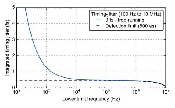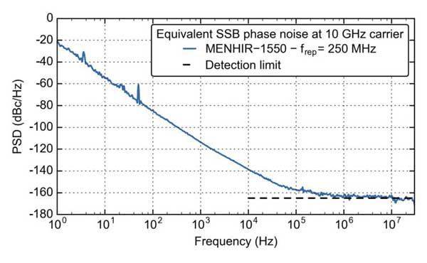 Menhir Photonics 為高精度時基分配提供極低位相噪聲、高可靠度的鎖模激光器。圖1展示了250MHz重復頻率的MenHIR-1550 的典型位相噪聲。相位噪聲在10GHz載波(40階諧波)上測量。噪聲本底給出的累積時間抖動上限越為500as(阿秒)。