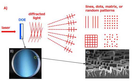 圖1:衍射光學(xué)元件的 A)使用示意;B)外形示意;C)表面微觀結(jié)構(gòu)示意