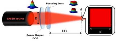 3) 靈活性。得益于微納加工技術(shù)的長(zhǎng)足發(fā)展,DOE可以針對(duì)不同的激光器或不同的目標(biāo)光強(qiáng)/位相分布進(jìn)行訂制。同時(shí),DOE應(yīng)用的光路結(jié)構(gòu)非常簡(jiǎn)單,在使用中搭配不同的透鏡,可實(shí)現(xiàn)不同幾何尺寸的光斑。