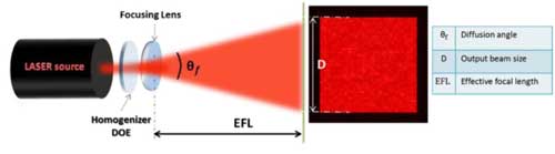 光束勻化器通常以“漫射角(diffusion angle)”來(lái)表征準(zhǔn)直光束經(jīng)過(guò)器件后的發(fā)散能力。可以選配不同焦距的透鏡來(lái)實(shí)現(xiàn)不同的投射面積。
