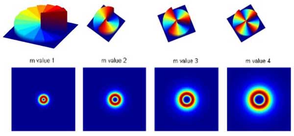 圖7:上:1~4階渦旋位相板的表面形貌(相延)示意圖
