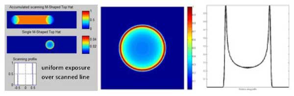 針對(duì)線掃描應(yīng)用中,高斯型/平頂型光斑會(huì)導(dǎo)致中心過(guò)曝的情況,導(dǎo)致刻槽兩端為弧形。M型光束發(fā)生器在工作面上構(gòu)建中心弱、邊緣強(qiáng)且銳利的光斑,避免這種情況發(fā)生。