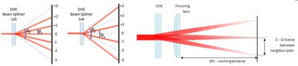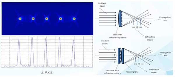 如圖14 (左)所示,多焦點(diǎn)DOE有兩種類型;一種類型集成了聚焦透鏡功能,其焦距、焦點(diǎn)間距是固定的;第二種類型由DOE產(chǎn)生多焦點(diǎn)效應(yīng),而焦距、焦點(diǎn)間距由附加透鏡決定。