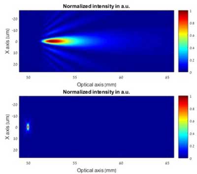 圖15 高斯光束(下)與貝塞爾光束(上)經(jīng)過(guò)相同透鏡后的焦斑軸向分布