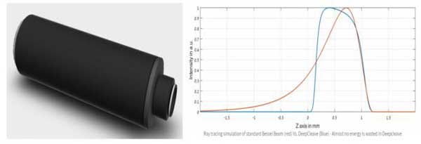 DeepCleave為專門為玻璃切割開(kāi)發(fā)的模組。針對(duì)玻璃或其它透明、硬脆材料,超快激光切割是最好的方法之一。當(dāng)切割厚度達(dá)到0.5mm以上式,需要考慮焦斑的焦深。DeepCleave可以實(shí)現(xiàn)在1~2mm范圍內(nèi)1.8微米束腰的光斑,尤其適合超快激光玻璃切割應(yīng)用。圖16(左)顯示了DeepCleave(藍(lán)色)與常規(guī)貝塞爾DOE(紅色)產(chǎn)生的焦斑的能量密度沿光軸的分布。DeepCleave可提供相當(dāng)長(zhǎng)距離內(nèi)均一的激光強(qiáng)度。