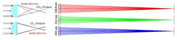 圖17 CO2/HeNe雙波長(zhǎng)衍射光學(xué)透鏡(左)及高功率三波長(zhǎng)消色差透鏡(右)的功能示意