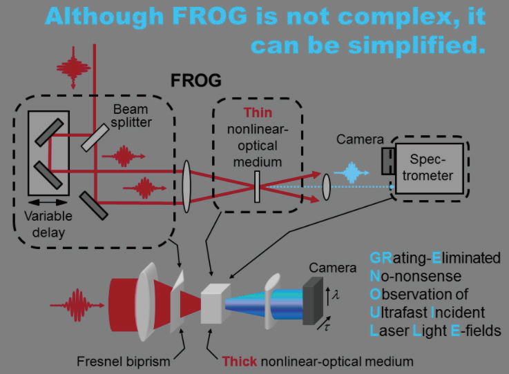 作為超快激光頻譜及位相測試方法的一種,F(xiàn)ROG(FrequencyResolved Optical Gating)是一種比SPIDER 更為簡便的方法,通過分析單次自相關信號的光譜,并輔以擬合運算程序來反解飛秒激光的時頻特征。Swamp Optics 公司多年來致力于FROG 類測量儀器的研制,并推出了功能更為強大、使用更為方便的GRENOUILLE 測量儀。