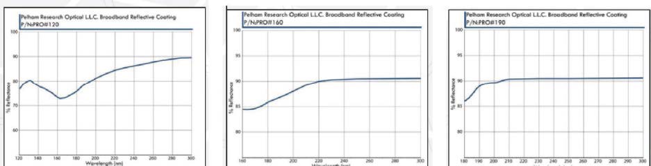 Pelham Research Optical(PRO)VUV / UV 寬帶鏡面涂層設計用于在真空臨界波長下提供良好的反射率。 為了確保質量的一致性,每個涂層批次在12 度入射角下測量反射率。可以根據客