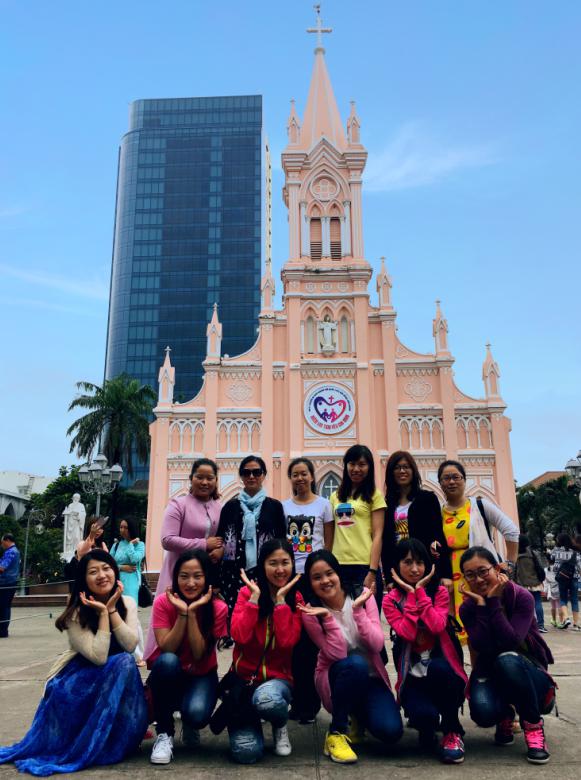 第四天的行程安排略顯緊湊,上午參觀粉紅色少女心的峴港大教堂及峴港博物館,下午即來到女生們逛買逛買的會安古鎮。如果說上午糖果般粉紅色的建筑讓我們的女同胞們感受到了夢幻,那下午到傍晚期間的會安之行,則可謂之漸入佳境。