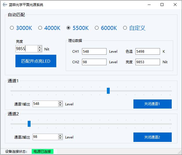LED 面板光源是一款可用于相機模組或傳感器產線校準的光源模擬器。選用兩組高低色溫的 LED 模塊實現 3000K~6000K 任意色溫和 100~15000Nit 任意亮度的大動態范圍輸出。并且保證有效發光面 200x200mm 內 95%以上的均勻性。可提供不同語言版本的 SDK 接口使用戶可集成到自有控制軟件。